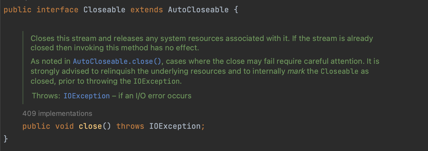 ๊ทธ๋ฆฌ๊ณ AutoCloseable์ idempotent๋ฅผ ๊ถ์ฅํ์ง๋ง, Closeable์ ๋ฐ๋์ idempotent ํด์ผ ํ๋ค.