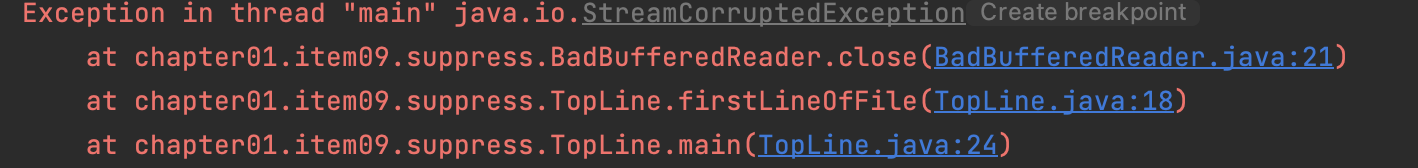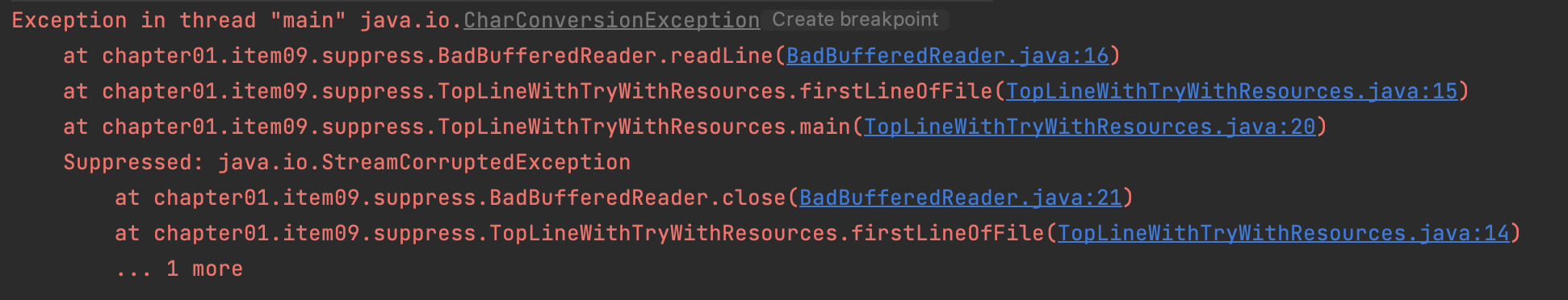 try-with-resources๋ฅผ ์ฌ์ฉํ๋ฉด readLine ๊ณผ close ์์ ๋ชจ๋ ์์ธ๊ฐ ๋ฐ์ํ๋ค๊ณ ํ๋ฉด readLine ๋ฉ์๋์์ ๋ฐ์ํ ์์ธ๊ฐ ๊ธฐ๋ก๋๊ณ , close์์ ๋ฐ์ํ ์์ธ๋ ์จ๊ฒจ์ง๋๋ฐ ์ด๋ฐ ์จ๊ฒจ์ง ์์ธ๋ค์ด ๊ทธ๋ฅ ๋ฒ๋ ค์ง๋๊ฒ์ด ์๋๋ผ ์คํ ์ถ์ ๋ด์ญ์์ Suppressed ๋ผ๊ณ ํด์ ๊ผฌ๋ฆฌํ๋ฅผ ๋ฌ๊ณ ์ถ๋ ฅํด์ฃผ๊ธฐ ๋๋ฌธ์