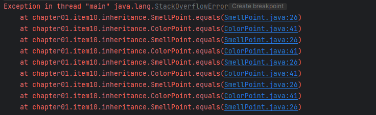 smellPoint.equals(colorPoint); // stackoverflowError ๋ฐ์