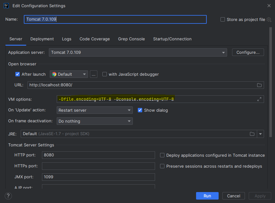 Edit Configurations Settings์์ VM Options์ ๋ฐ์ ๋๊ฐ๋ฅผ ์ถ๊ฐํด์ฃผ๋๊น ์ด์ ํด๊ฒฐ ๋๋ค ๐