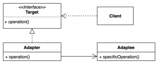 : ๊ธฐ์กด ์ฝ๋๋ฅผ ํด๋ผ์ด์ธํธ๊ฐ ์ฌ์ฉํ๋ ์ธํฐํ์ด์ค์ ๊ตฌํ์ฒด๋ก ๋ฐ๊ฟ์ฃผ๋ ํจํด์ ๋งํ๋ค.