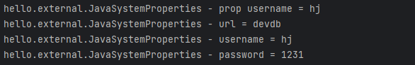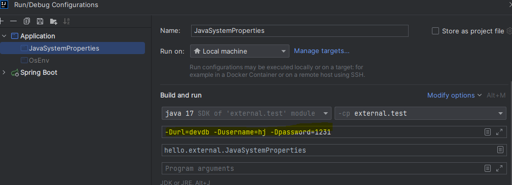 java -Durl=devdb -Dusername=hj -Dpassword=1231 -jar XXX.jar