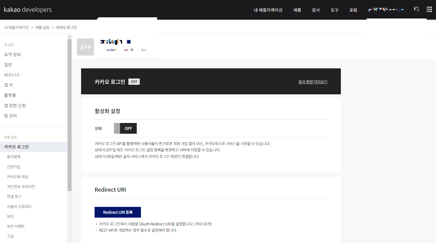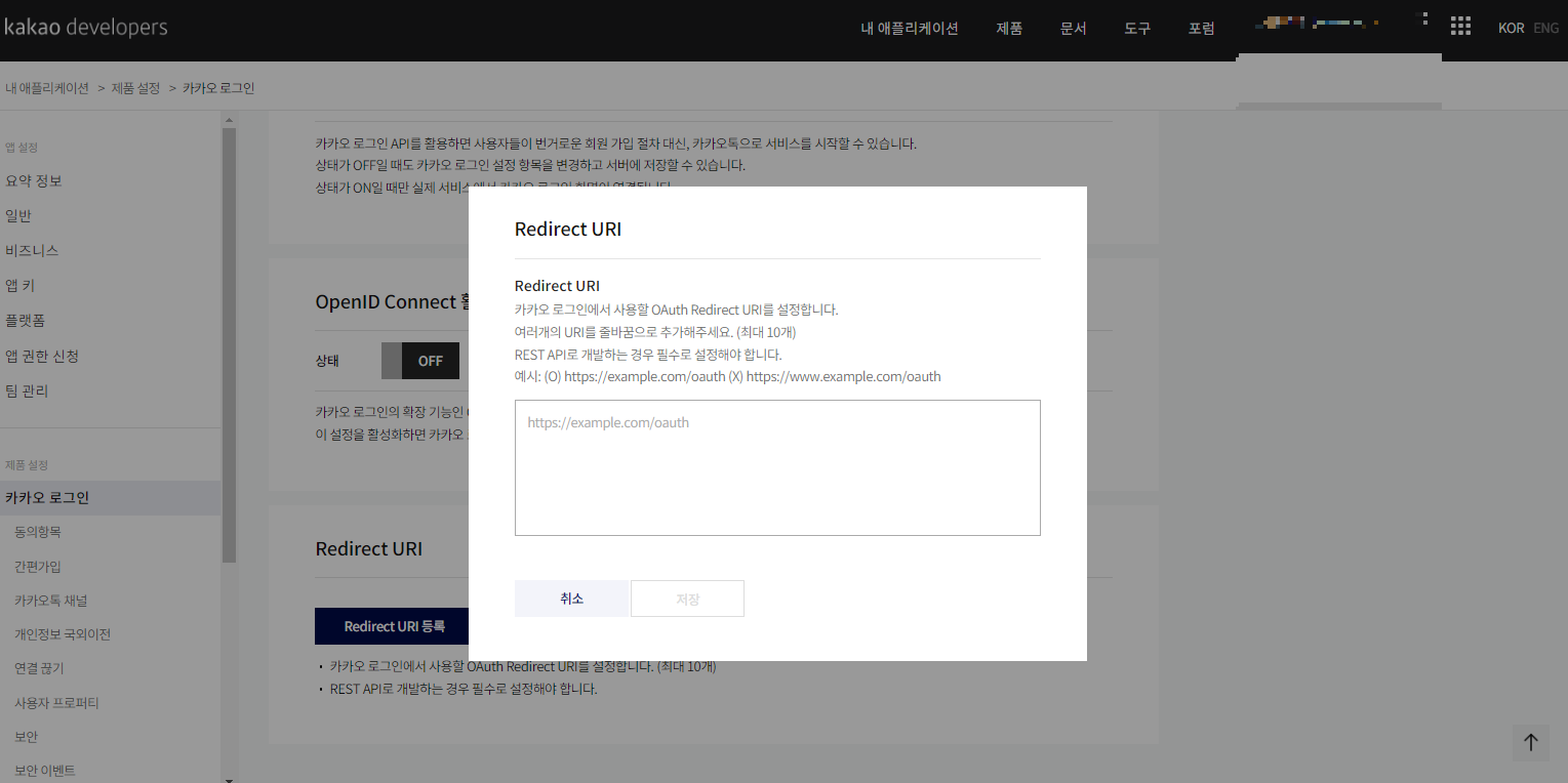 ๊ทธ ๋ค์ ์นด์นด์ค ๋ก๊ทธ์ธ ์ฌ์ฉ ์ ์ฝ๋ฐฑ ๋ฐ์ Redirect URI ๋ฅผ ๋ฑ๋กํด์ผ ํ๋ค.