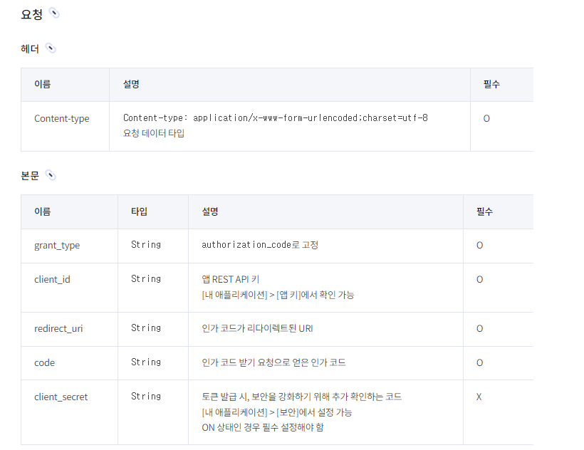 -> https://kauth.kakao.com/oauth/token ์ ๋ฐ์ grant_type์ authorization_code๋ก ๊ณ ์ ํ๊ณ , client_id, redirect_uri, code ๋ฅผ ๋ด์ post๋ก ์์ฒญํ๋ค.