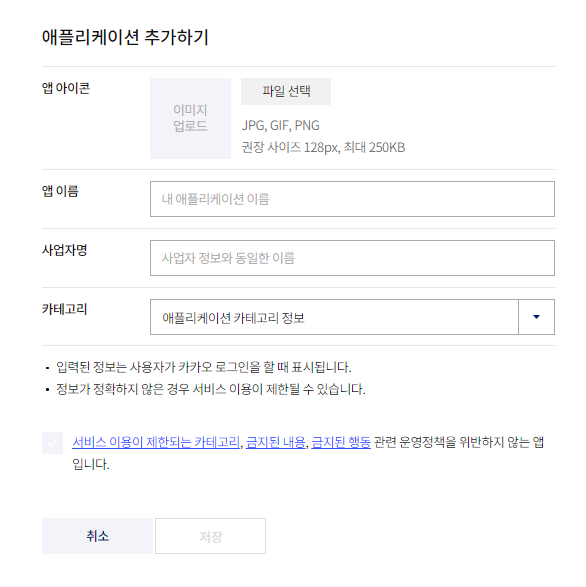 ์ฌ๊ธฐ์ ๊ฐ์ ๋ก๊ทธ์ธ ์๋น์ค๋ฅผ ํ ์ฑ ์ด๋ฆ, ์ฌ์ ์๋ช , ์นดํ ๊ณ ๋ฆฌ ๋ฑ์ ์์ฑํด์ค๋ค.