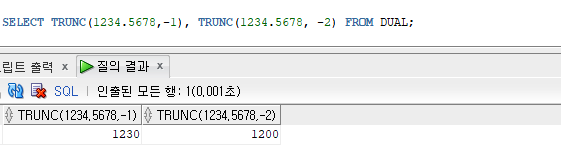 TRUNC() ํจ์๋ ๋ฒ๋ฆผ๊ฐ์ผ๋ก ๊ตฌํ๋ ๊ธฐ๋ฅ์ผ๋ก, ๋งค๊ฐ๋ณ์๋ก ์ ๋ ฅํ '์์น'๋ฅผ ๋ฒ๋ฆผํด '์๋ฆฟ์'๋งํผ์ ๊ฐ์ ๊ตฌํ๋ค.