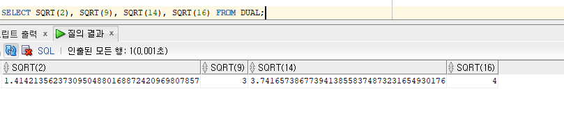 SQRT() ํจ์๋ ์ ๊ณฑ๊ทผ์ ๊ตฌํ๋ ๊ธฐ๋ฅ์ด๋ค.