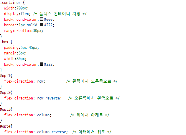 flex-direction 속성은 플렉스 컨테이너 안에서 플렉스 항목을 배치하는 주축과 방향을 지정하는 속성이다.