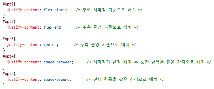 justify-content 속성은 주축에서 플렉스 항목 간의 정렬 방법을 지정한다.