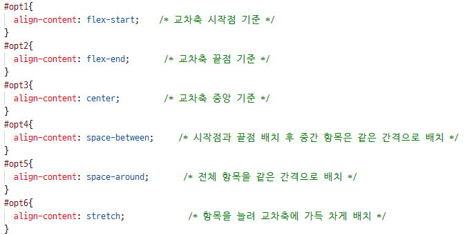 align-content 는 주축에서 줄 바뀜에 생겨서 플렉스 항목을 여러 줄로 표시할 때 align-content 속성을 이용하면 플렉스 항목의 간격을 지정할 수 있다.