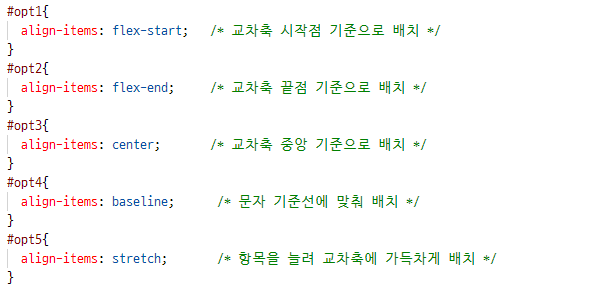 align-items 속성은 교차축을 기준으로 플렉스 항목을 정렬한다.