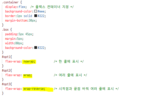 flex-wrap 속성은 플렉스 컨테이너 너비보다 많은 플렉스 항목이 있을 경우 줄을 바꿀지 여부를 지정한다.