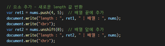 push : ๋ฐฐ์ด์ ๋งจ ๋์์ ์๋ก์ด ์์๋ฅผ ์ถ๊ฐํ ํ ์๋ก์ด length๋ฅผ ๋ฐํํ๋ค.