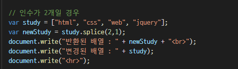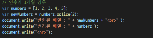 slice() ๋ฉ์๋๋ ๊ธฐ์กด ๋ฐฐ์ด์ ์ํฅ์ ์ฃผ์ง ์์ง๋ง, splice() ๋ฉ์๋๋ ์์๋ฅผ ์ถ๊ฐ, ์ญ์ ํ๋ฉด ๊ธฐ์กด ๋ฐฐ์ด ์์ฒด๊ฐ ์์ ๋๋ค.