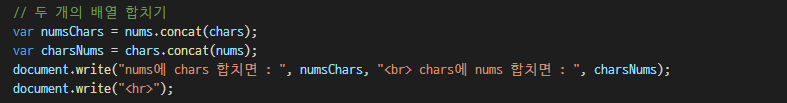 concat() ๋ฉ์๋๋ ์๋ก ๋ค๋ฅธ ๋ฐฐ์ด 2๊ฐ๋ฅผ ํฉ์ณ์ ์๋ก์ด ๋ฐฐ์ด์ ๋ง๋ ๋ค.