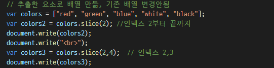 slice() ๋ฉ์๋๋ ๊ธฐ์กด ๋ฐฐ์ด์ ๋ฐ๊พธ์ง ์์ผ๋ฉด์ ์์๋ฅผ ๊บผ๋ผ ์ ์๋ค.