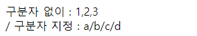 ์ด๋ ์์ ์ฌ์ด์ ๊ตฌ๋ถ์๋ฅผ ๋ฃ์ ์ ์๋๋ฐ ๋ฐ๋ก ์ง์ ํ์ง ์์ผ๋ฉด , ๋ก ๊ตฌ๋ถ๋๋ค.
