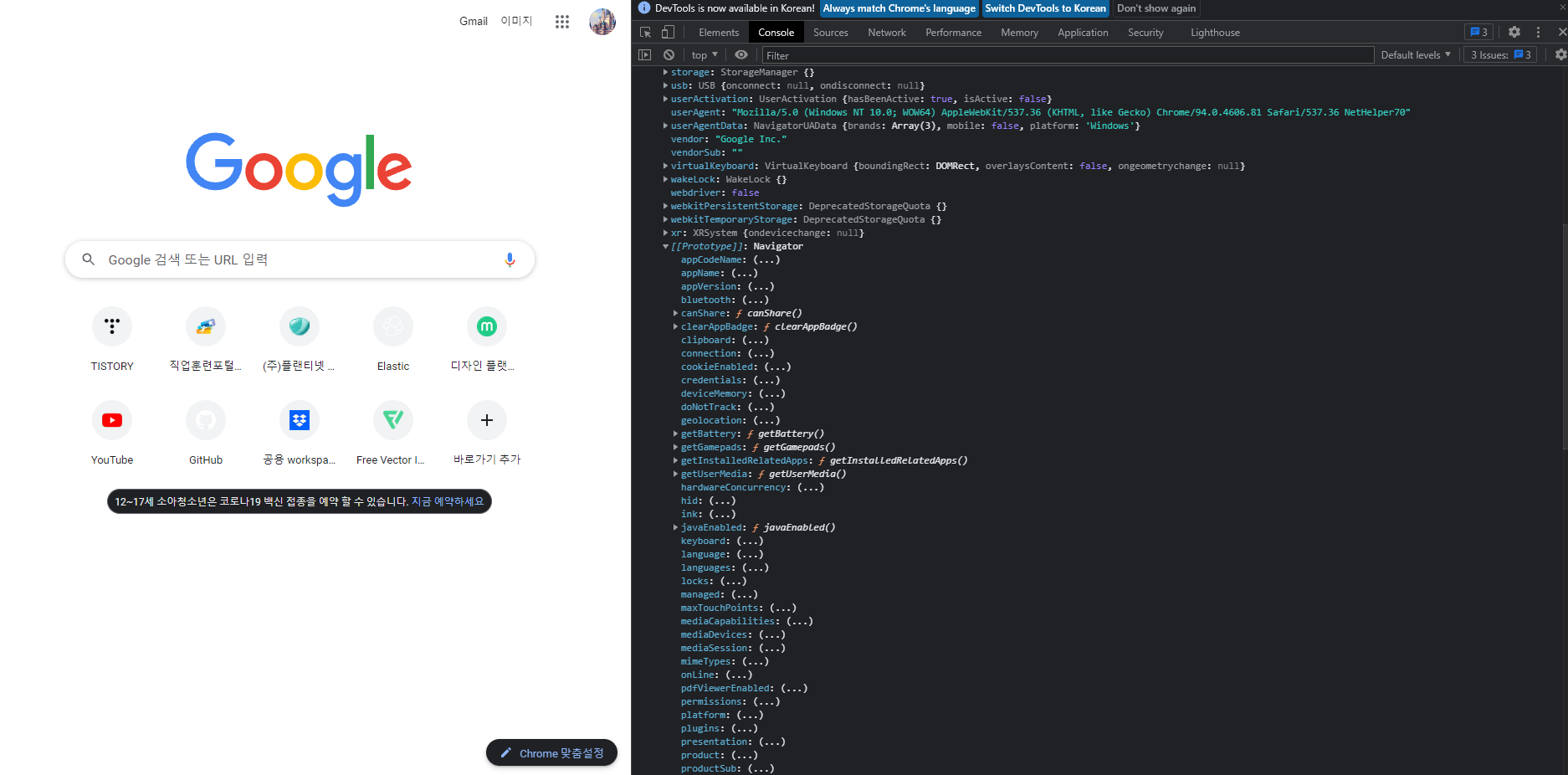 navigator ๊ฐ์ฒด ์ ๋ณด๋ ๋ธ๋ผ์ฐ์ ํด๋ฆญํ๊ณ ๊ฐ๋ฐ์ ๋๊ตฌ์์ console์ navigator๋ผ๊ณ ์ ๋ ฅํ๋ฉด ๋ณผ ์ ์๋ค.