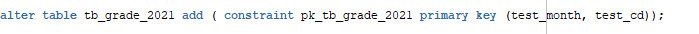 1๏ธโฃ ALTER TABLE ํ ์ด๋ธ๋ช ADD (CONSTRAINT ๊ธฐ๋ณธํค๋ช PRIMARY KEY ( ํ๋๋ช 1, ํ๋๋ช 2...));