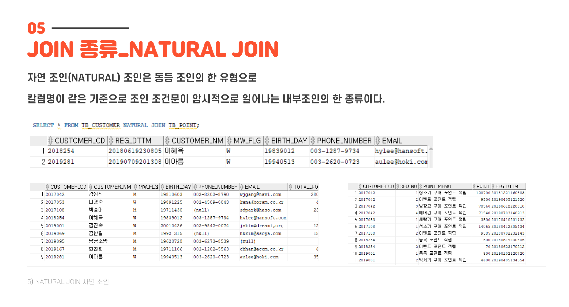๋ฐ์ ํ ์ด๋ธ์์ CUSTOMER_CD๊ฐ ๊ฐ์ ๊ฒฐ๊ณผ๋ก NATURAL JOIN ๊ฒฐ๊ณผ๊ฐ ๋ํ๋๊ฒ์ ํ์ธํ ์ ์๋ค.