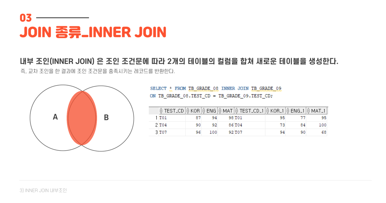 INNER JOIN์ ์กฐ์ธ ์กฐ๊ฑด๋ฌธ์ ๋ฐ๋ผ 2๊ฐ์ ํ ์ด๋ธ์ ์ปฌ๋ผ์ ํฉ์ณ ์๋ก์ด ํ ์ด๋ธ์ ์์ฑํ๋ ๊ฒ์ด๋ค.