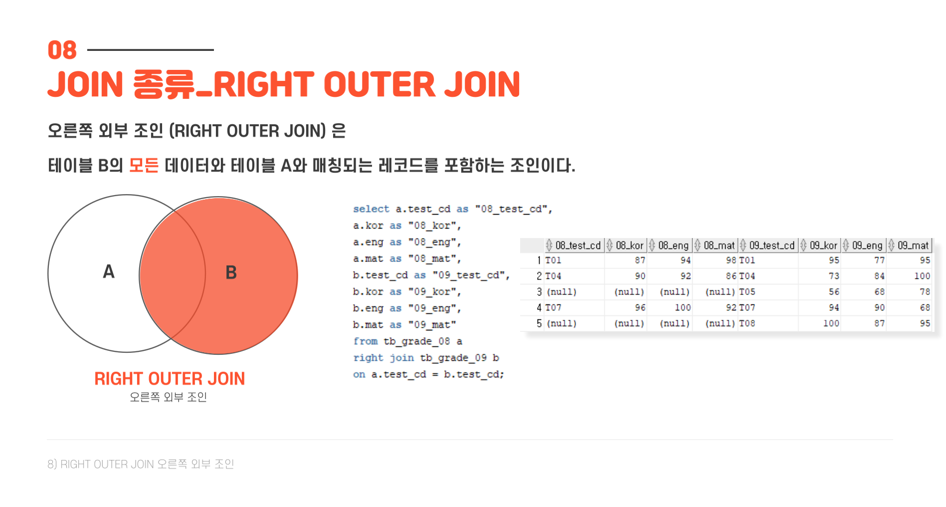 ์ค๋ฅธ์ชฝ ์ธ๋ถ ์กฐ์ธ์ ํ ์ด๋ธ B์ ๋ชจ๋ ๋ฐ์ดํฐ์ ํ ์ด๋ธ A์ ๋งค์นญ๋๋ ๋ ์ฝ๋๋ฅผ ํฌํจํ๋ ์กฐ์ธ์ด๋ค.