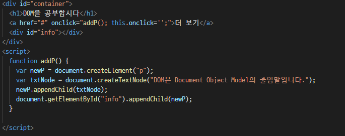 ์ด๋ onclick = "addP(); this.onclick = ' ' ; " ๋ก ์ค์ ํ ์ด์ ๋ addP() ํจ์๋ฅผ ํ๋ฒ๋ง ์คํ๋๋๋ก ํ๊ธฐ ์ํด์์ด๋ค.