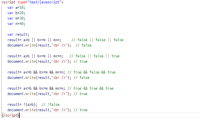 ! : not ์ฐ์ฐ์๋ผ๊ณ ๋ถ๋ฅด๋ฉฐ, ํผ์ฐ์ฐ์์ ๊ฐ์ด true์ด๋ฉด ๋ฐ๋๋ก false ๋ฐํํ๋ค.