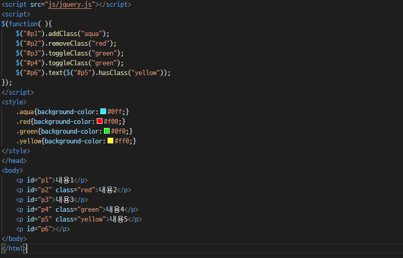 $("μμ μ ν").addClass("class κ°"); addClass() λ©μλλ μ νν μμμ ν΄λμ€λ₯Ό μμ±νλ€.