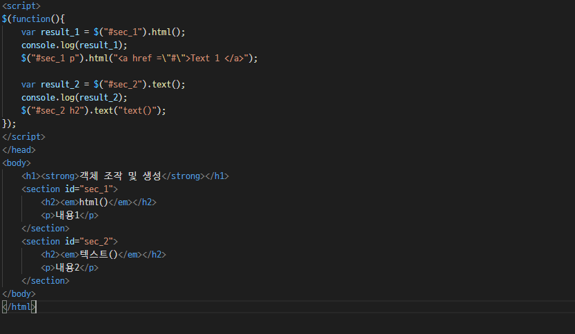 html() λ©μλλ μ νν μμμ νμ μμλ₯Ό κ°μ Έμ λ¬Έμμ΄λ‘ λ°ννκ±°λ νμ μμλ₯Ό μ λΆ μ κ±°νκ³ μ μμλ‘ λ°κΏ λ μ¬μ©νλ€.