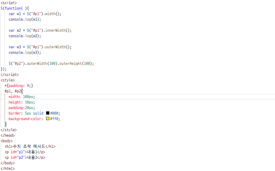 outerHeight()μ outerWeight() λ©μλλ μ¬λ°± λ° μ μ ν¬ν¨ν μμμ λμ΄κ°κ³Ό λλΉκ°μ κ³μ°νλ€.