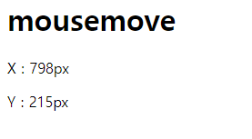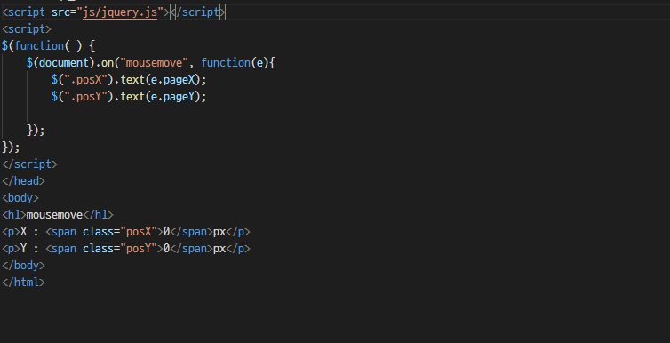 - mousemove ์ด๋ฒคํธ๊ฐ ๋ฐ์ํ ๋๋ง๋ค ๋ง์ฐ์ค ํฌ์ธํฐ์ ์ขํ๊ฐ์ ๊ฐ๊ฐ ์ถ๋ ฅํ๋ ์์