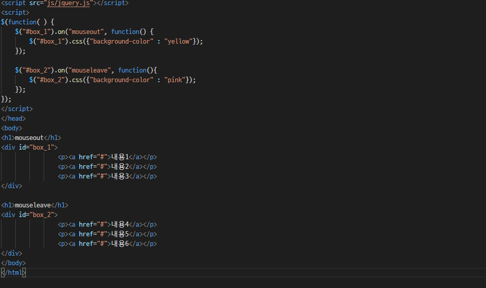 $("์ด๋ฒคํธ ๋์ ์ ํ").on("mouseout", function() {์๋ฐ์คํฌ๋ฆฝํธ ์ฝ๋;});