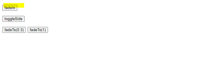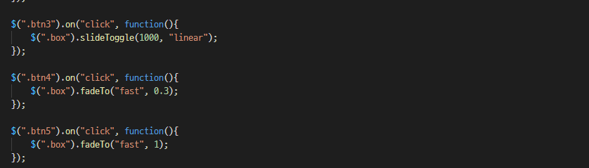 $("์์ ์ ํ").fadeTo(ํจ๊ณผ ์์ ์๊ฐ, ํฌ๋ช ๋, ์ฝ๋ฐฑํจ์); -> ์ด๋ ํฌ๋ช ๋๋ 0~1์ฌ์ด์ ๊ฐ์ผ๋ก ์ง์ ํ ์ ์๋ค.