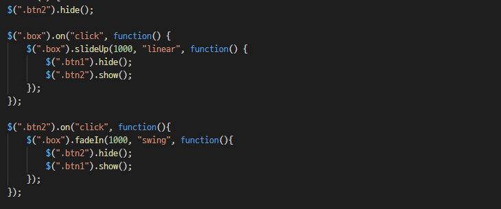 slideUp() ์์๊ฐ ์๋ก ์ ํ๋ฉฐ ์จ๊ฒจ์ง๋ค.
