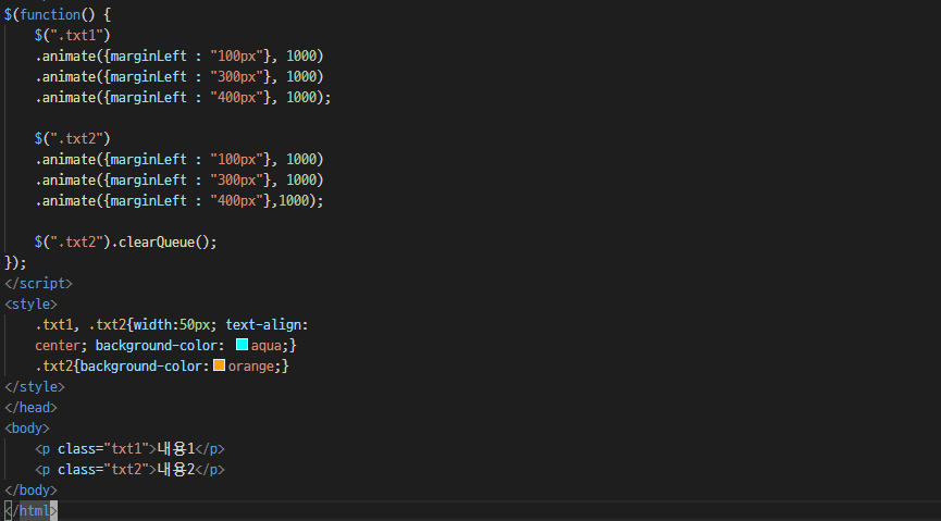 clearQueue() νμμ μ²μμΌλ‘ μ§ννκ³ μλ μ λλ©μ΄μ λ§ μ μΈνκ³ λκΈ° μ€μΈ μ λλ©μ΄μ μ λͺ¨λ μ κ±°νλ€.