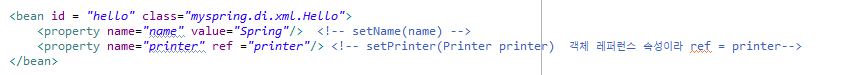 ๊ทธ๋ฆฌ๊ณ setPrinter์ Printer๋ผ๋ Bean์ ์ฃผ์ ํด์ค์ผํ๊ธฐ ๋๋ฌธ์ ref ์์ฑ์ผ๋ก ์ค์ ํ๋ค.