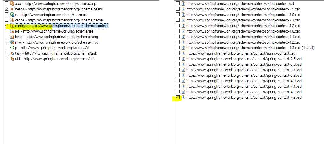 beans.xml ํ์ผ ๋ฐ์ Namespaces๋ฅผ ํด๋ฆญํ๋ค.