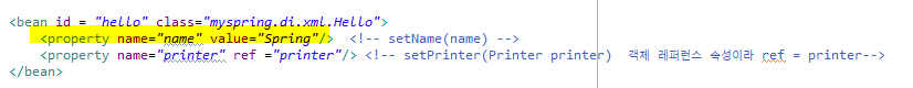 Hello ํด๋์ค์ setter ๋ฉ์๋๋ฅผ ํตํด Bean ์ฃผ์ ํ ๋ property ํ๊ทธ๋ฅผ ์ฌ์ฉํ๋ค.