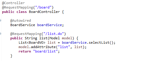 DispathcherServlet์ด ํด๋ผ์ด์ธํธ์ ์์ฒญ์ ๋ฐ์ url๊ณผ ์์ฒญ ์ ๋ณด๋ฅผ ๊ธฐ์ค์ผ๋ก HandlerMapping์ ํตํด ๋ชจ๋ธ ๊ฐ์ฒด ๋ฉ์๋๋ฅผ ํธ์ถํ๋ค. ๊ทธ๋ฆฌ๊ณ ๋ชจ๋ธ์์ ์์ฒญ์ ๋ํด ์ฒ๋ฆฌํ๊ณ , ์ฒ๋ฆฌ ๊ฒฐ๊ณผ ๋ฐ์ดํฐ๋ฅผ model์ ๋ด์ board/list.jsp ์ ๋ฆฌํดํ๋ค.