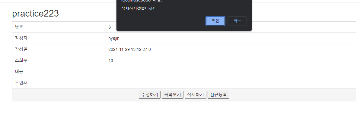 ๊ทธ๋ฆฌ๊ณ ํด๋น ๊ธ์ ์ญ์ ํ๊ณ ์ถ์ ๋ ์ญ์ ํ๊ธฐ ๋ฒํผ์ ๋๋ฅด๋ฉด ์ฌ์ฉ์์๊ฒ ํ๋ฒ ๋ ํ์ธํ๋ ํ์ธ์ฐฝ์ ๋์ ์ฌ์ฉ์๊ฐ ํ์ธ ๋ฒํผ์ ๋๋ฌ์ผ ์ญ์ ๊ฐ ๋์ํ๋๋ก ํ๋ค.