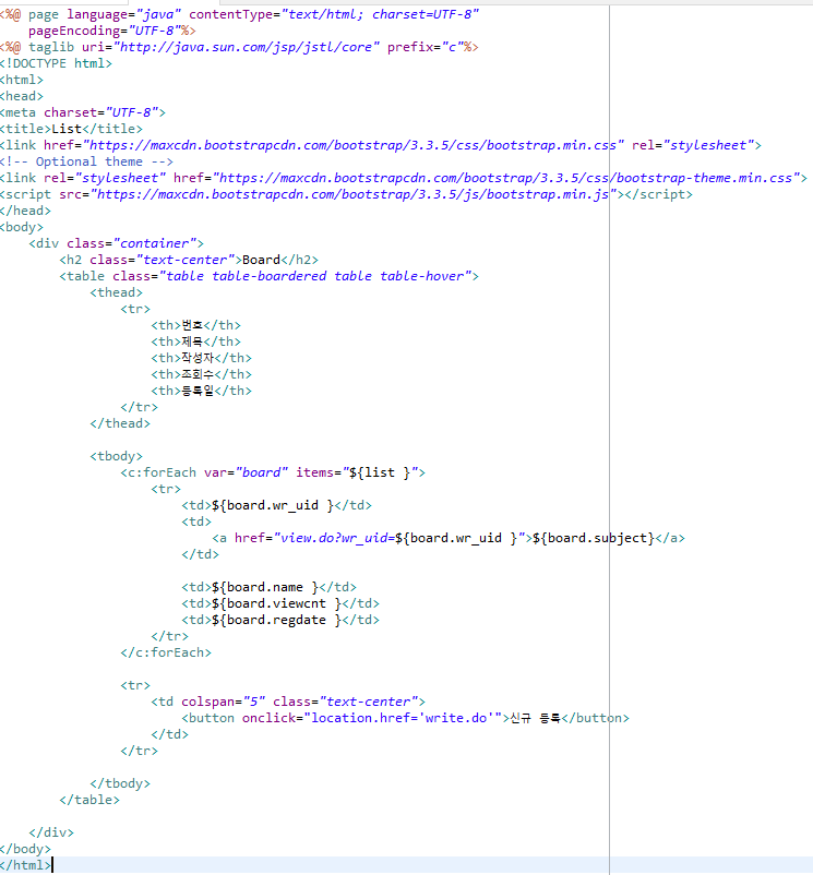 list.jsp์์๋ ์ ๋ฌ๋ฐ์ ๊ฐ์ฒด๋ฅผ ${list}๋ก ๋ฐ์์ jstl core ๋ผ์ด๋ธ๋ฌ๋ฆฌ๋ฅผ ์ฌ์ฉํด ๋ฐ๋ณต๋ฌธ์ผ๋ก ํ ์ด๋ธ์ ๋ชฉ๋ก์ ์ถ๋ ฅํด์ค๋ค.