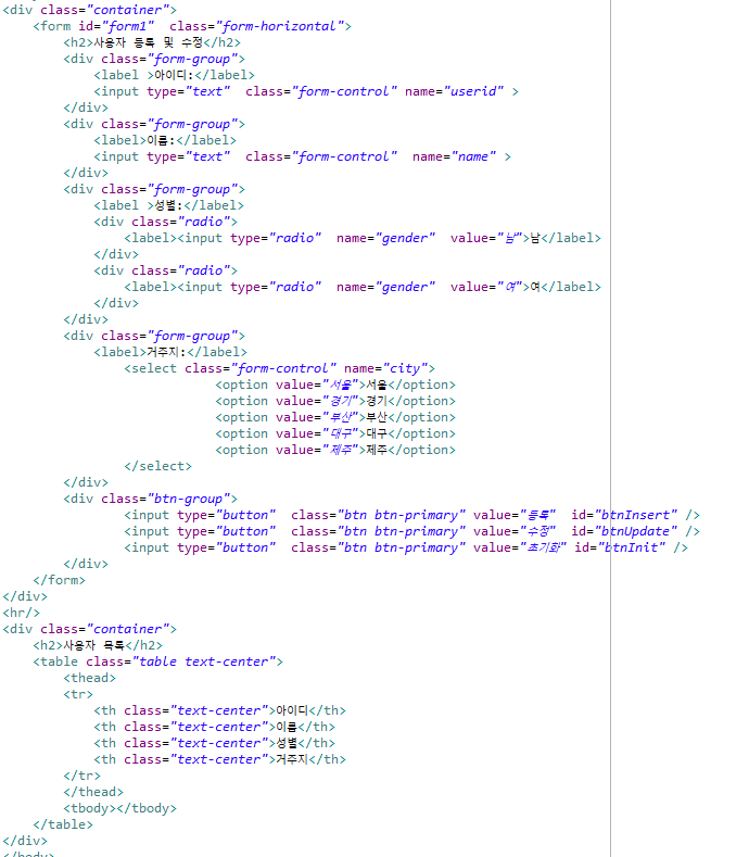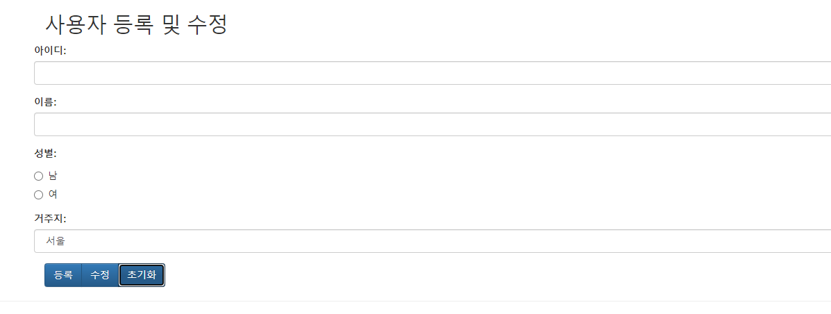 ํผ์ ๊ฐ๊ฐ ๊ฐ์ ์ ๋ ฅํ๊ณ , ๋ฑ๋ก ๋ฒํผ์ ๋๋ฅด๋ฉด userid, name, gender, city์ ์ ๋ ฅ๋ ๊ฐ์ ๊ฐ์ ธ์์ var userid, name, gender, city์ ์ ์ฅํ๋ค.