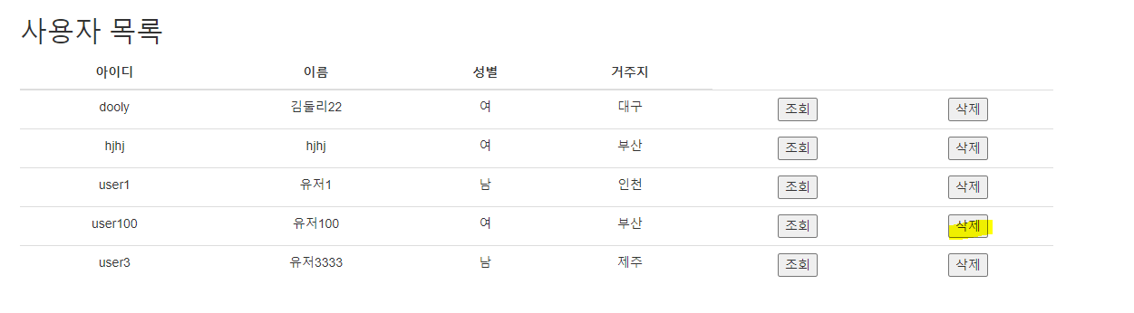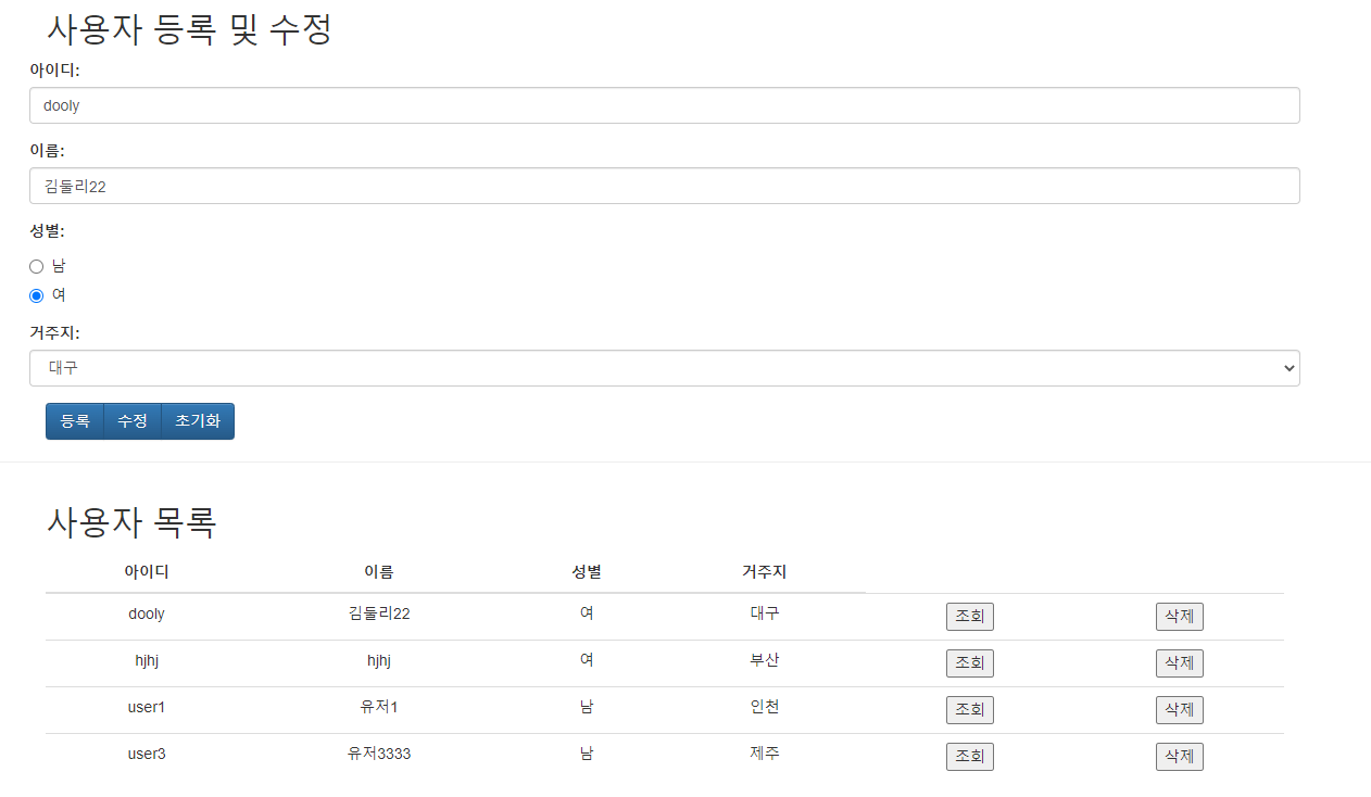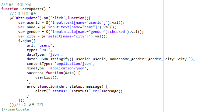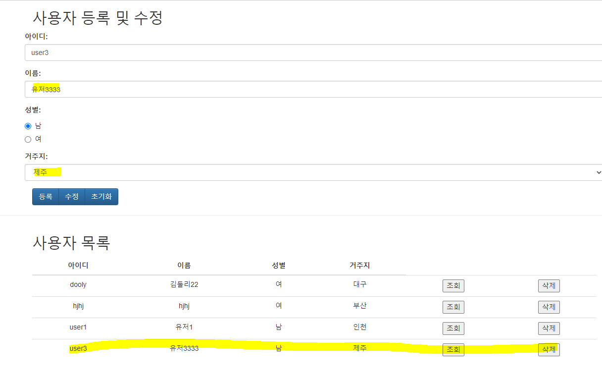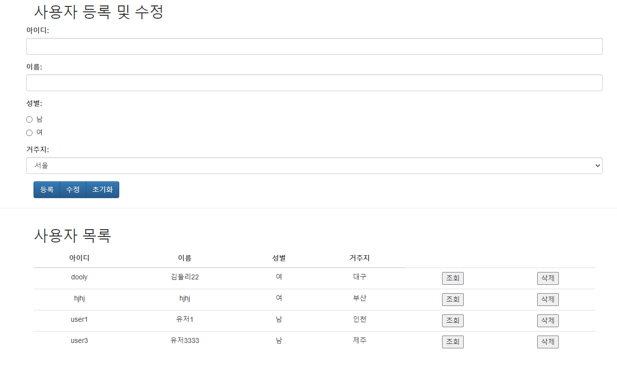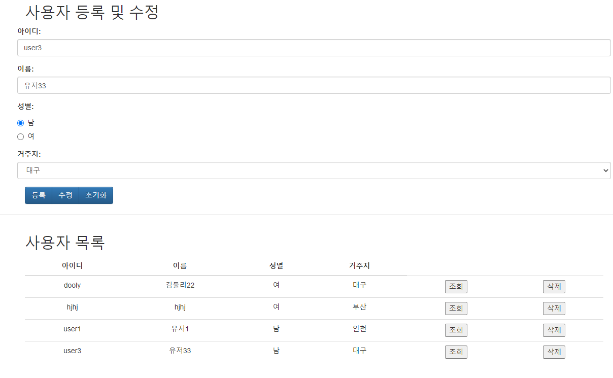 ์ฌ๊ธฐ์ ํ๋ ์ฌ์ฉ์ ๊ด๋ฆฌ์ ๋ํด์ RESTful ์น ์๋น์ค ํธ์ถ์ ์ํด Ajax ํต์ ๋ฐฉ๋ฒ์ ์ด์ฉํ ์์ ์ด๋ค.