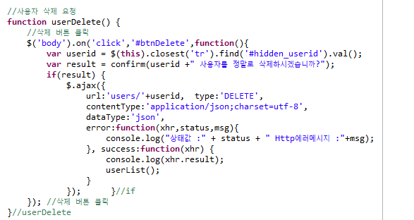 ๊ทธ๋ฆฌ๊ณ ์ฌ์ฉ์๊ฐ ํ์ธ๋ฒํผ์ ๋๋ฅด๋ฉด ajax๋ก ์๋ฒ๋ก ์ญ์ ๋ฅผ ์์ฒญํ๋ค.
