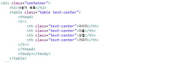 -> html์๋ <thead>๋ง ์์ฑํ๊ณ , ์๋ฒ๋ก๋ถํฐ ๋ฐ์ ์ฌ์ฉ์ ๋ฐ์ดํฐ๋ฅผ ์ด์ฉํ์ฌ ๋์ ์ผ๋ก ํ ์ด๋ธ์ row๋ฅผ ์ฆ๊ฐ์ํฌ๊ฒ์ด๋ค.
