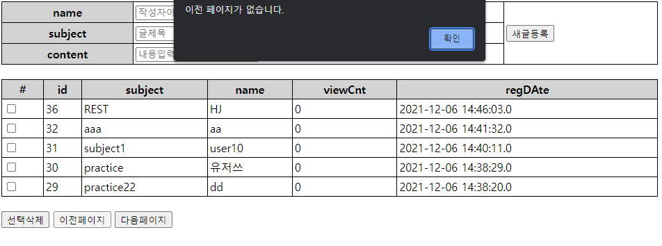 ๊ทธ๋ฆฌ๊ณ ๋์๋ ์ด์  ๋ฒํผ์ ๋๋ฅด๋ฉด ํ์ฌ ํ์ด์ง๊ฐ์ ๋ฐ์์ 1์ด๋ฉด alert๋ฅผ ํตํด ์ด์  ํ์ด์ง๊ฐ ์๋ค๊ณ ์๋ ค์ฃผ๋ฉฐ,