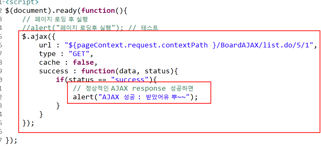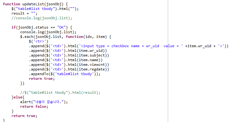 ๊ทธ๋ฆฌ๊ณ loadPage์์ ํด๋นํ๋ url๋ก ์ ๋ ฅํด ๋ฐ์ response์ status ๊ฐ success์ด๋ฉด selectByRow ์ํํ result์ ๋ด์์จ ๋ฐ์ดํฐ๋ฅผ responseํด์ ํด๋นํ๋ ๋ฐ์ดํฐ ์ ๋งํผ ํ ์ด๋ธ์ row๋ฅผ ๋์ ์ผ๋ก ์์ฑํด์ฃผ๋ ์ฝ๋์ด๋ค.