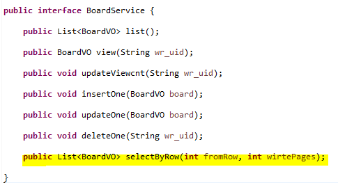 - ๋ค์์๋ ์๋ ์์ฑ๋์์๋ BoardService, BoardDAO, BoardMapper๋ฑ์ ํ์ด์งํ๊ธฐ ์ํ ๋ฉ์๋๋ค์ ์ถ๊ฐํด์ค๋ค.