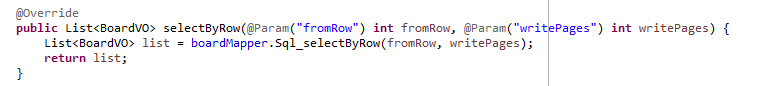 ์ด๋ ํ๋ผ๋ฏธํฐ๋ก ๋์ด์จ BoardVO ๊ฐ์ด ๋์ด ์๋๊ณ , ํฌ๊ธฐ๊ฐ 0 ์ด์์ด๋ผ๋ฉด status๋ ok, count์๋ ๋ฆฌ์คํธ์ ํฌ๊ธฐ๋ฅผ ์ ์ฅํด์ฃผ๋ฉฐ, list์ selectByRow ์ํ ๊ฒฐ๊ณผ๋ฅผ ๋ด์์ค๋ค.